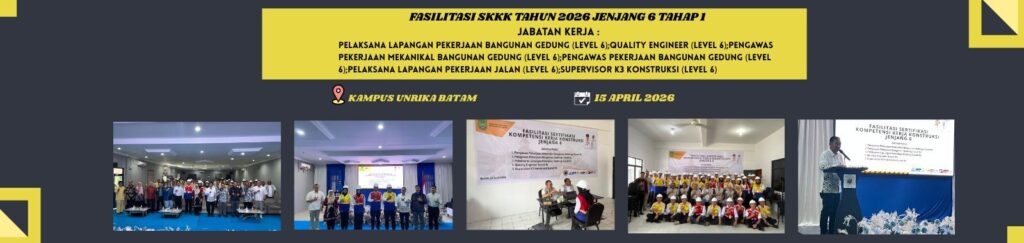 Kegiatan fasilitasi sertifikasi jenjang 6 jabatan kerja pelaksana lapangan pekerjaan gedung;quality engineer;pengawas pekerjaan bangunan gedung;pekerjaan mekanikal bangunan gedung;pelaksana lapangan pekerjaan jalan; dan supervisor k3 konstruksi. Kegiatan ini dilaksanakan di Universitas Riau Kepulauan (Unrika). Pesatnya pembangunan infrastruktur di kota batam memerlukan dukungan sumber daya manusia (sdm) konstruksi yang terampil dan profesional. Karena itu pemko batam berkewajiban dan ikut mendorong peningkatan kualitas sdm di sektor jasa konstruksi. Salah satu mitigasi persoalan kekurangan sdm yg kompeten dan bersertifikat kompetensi kerja konstruksi dengan menggandeng lulusan fresh graduate dari universitas di kota batam.
