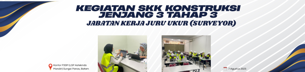 Kegiatan SKK Konstruksi Jenjang 3 Tahap 3 ini diikuti 14 Peserta dari Kalangan Mahasiswa/i di Kota Batam yang diadakan pada Tanggal 7 Agustus 2025 di Kantor P3SM (LSP Astekindo Mandiri) Sungai Panas, Batam. Dengan harapan Sertifikat yang didapat menjadi bekal untuk meningkatkan nilai profesional dan siap untuk bekerja.